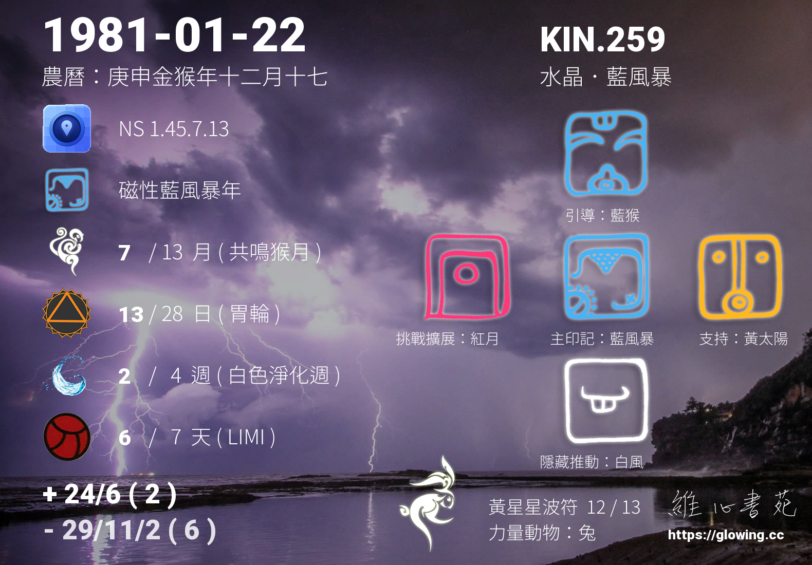 我們可以稱 KIN 259 為 【水晶藍風暴】 、 【水晶的藍風暴】 、 【黃星星波符 之 水晶藍風暴】 也可以是 【水晶藍風暴.黃星星波符】 ,你比較喜歡哪一個稱號呢?