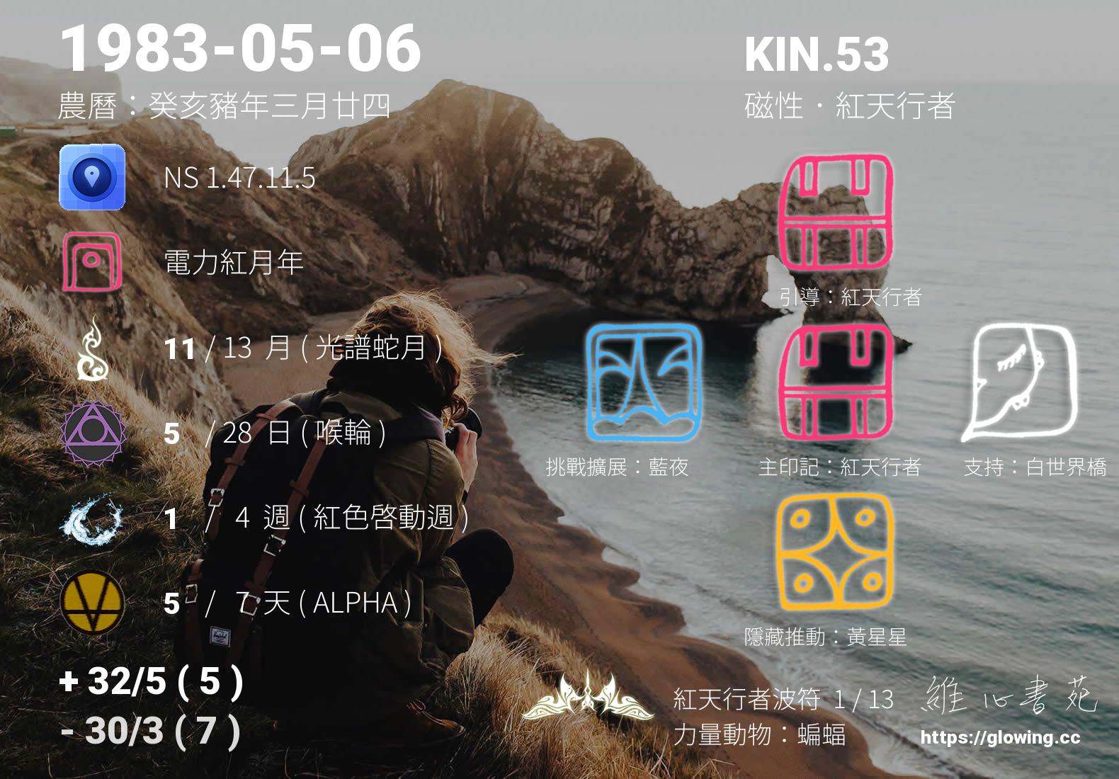 紅天行者的引導依據KIN的調性不同會有五種可能性,KIN.53的引導圖騰是紅天行者 , 紅天行者引導著我們往更高遠的天體運行仰望,神聖的力量不在宗教不在聖所,在我們行走的路上,我們所識的萬事萬物都是神聖的一部分,我們走一步,靈魂算一步,每一步都堅實且美麗,對應天體運行,逐夢踏實。