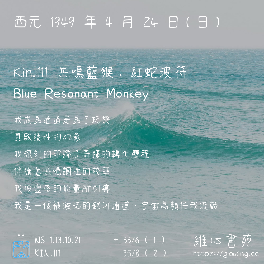 我們可以稱 KIN 111 為 【共鳴藍猴】 、 【共鳴的藍猴】 、 【紅蛇波符 之 共鳴藍猴】 也可以是 【共鳴藍猴.紅蛇波符】 ,你比較喜歡哪一個稱號呢?