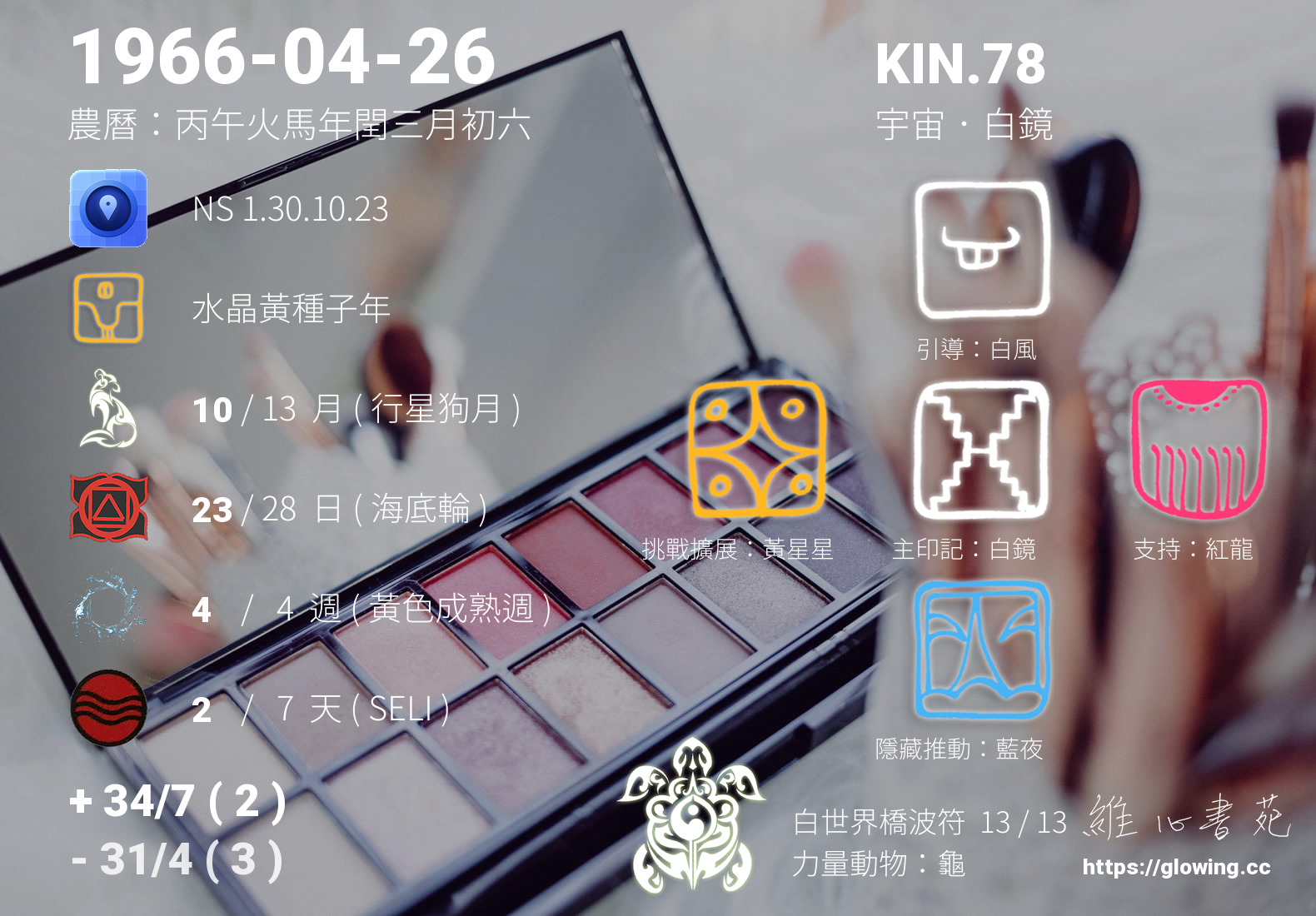 我們可以稱 KIN 78 為 【宇宙白鏡】 、 【宇宙的白鏡】 、 【白世界橋波符 之 宇宙白鏡】 也可以是 【宇宙白鏡.白世界橋波符】 ,你比較喜歡哪一個稱號呢?