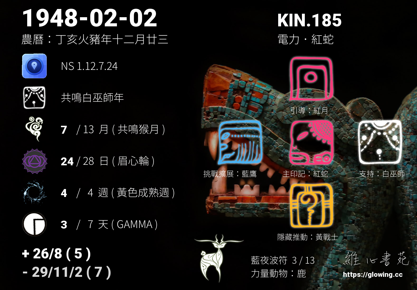 我們可以稱 KIN 185 為 【電力紅蛇】 、 【電力的紅蛇】 、 【藍夜波符 之 電力紅蛇】 也可以是 【電力紅蛇.藍夜波符】 ,你比較喜歡哪一個稱號呢?
