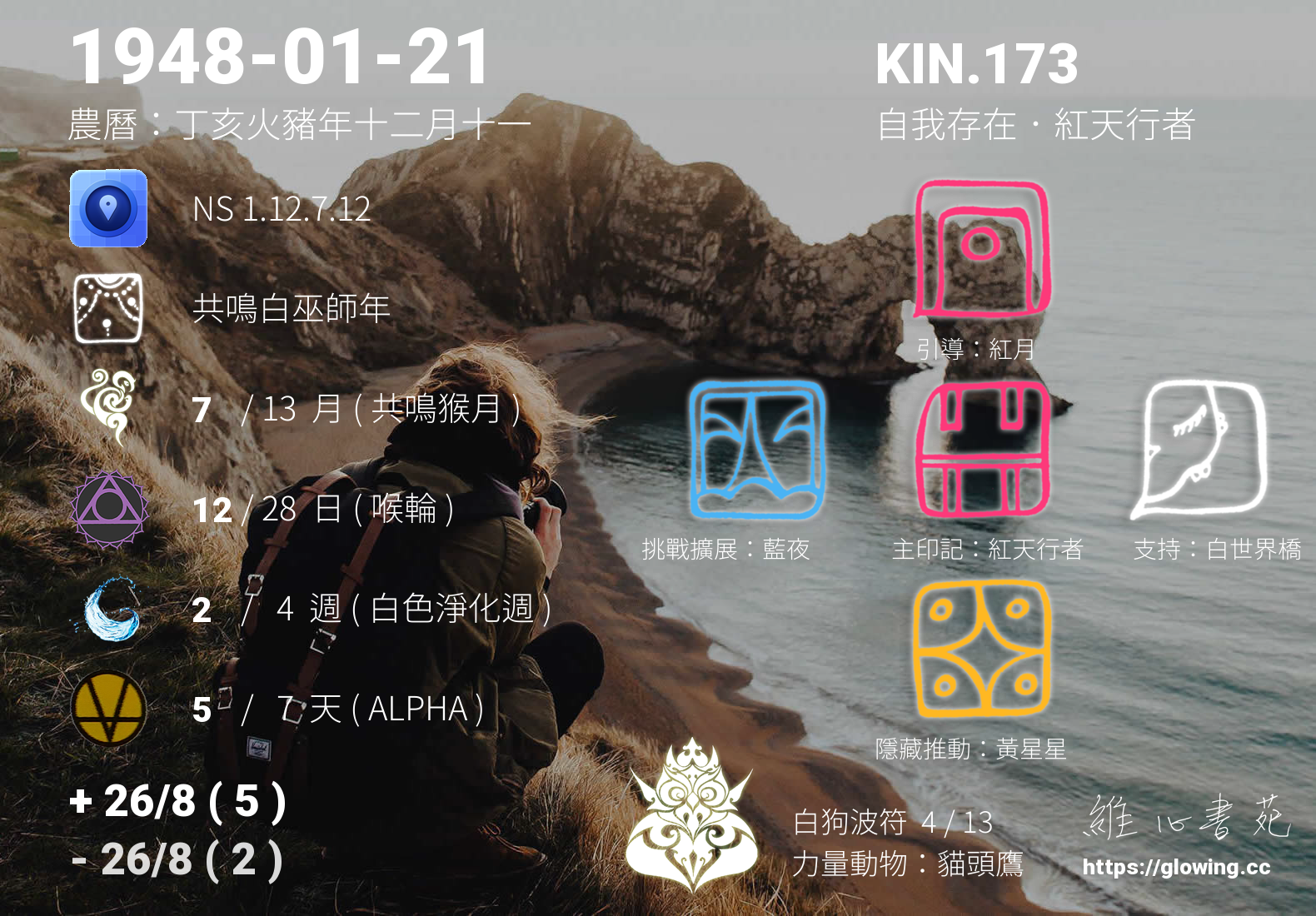我們可以稱 KIN 173 為 【自我存在紅天行者】 、 【自我存在的紅天行者】 、 【白狗波符 之 自我存在紅天行者】 也可以是 【自我存在紅天行者.白狗波符】 ,你比較喜歡哪一個稱號呢?
