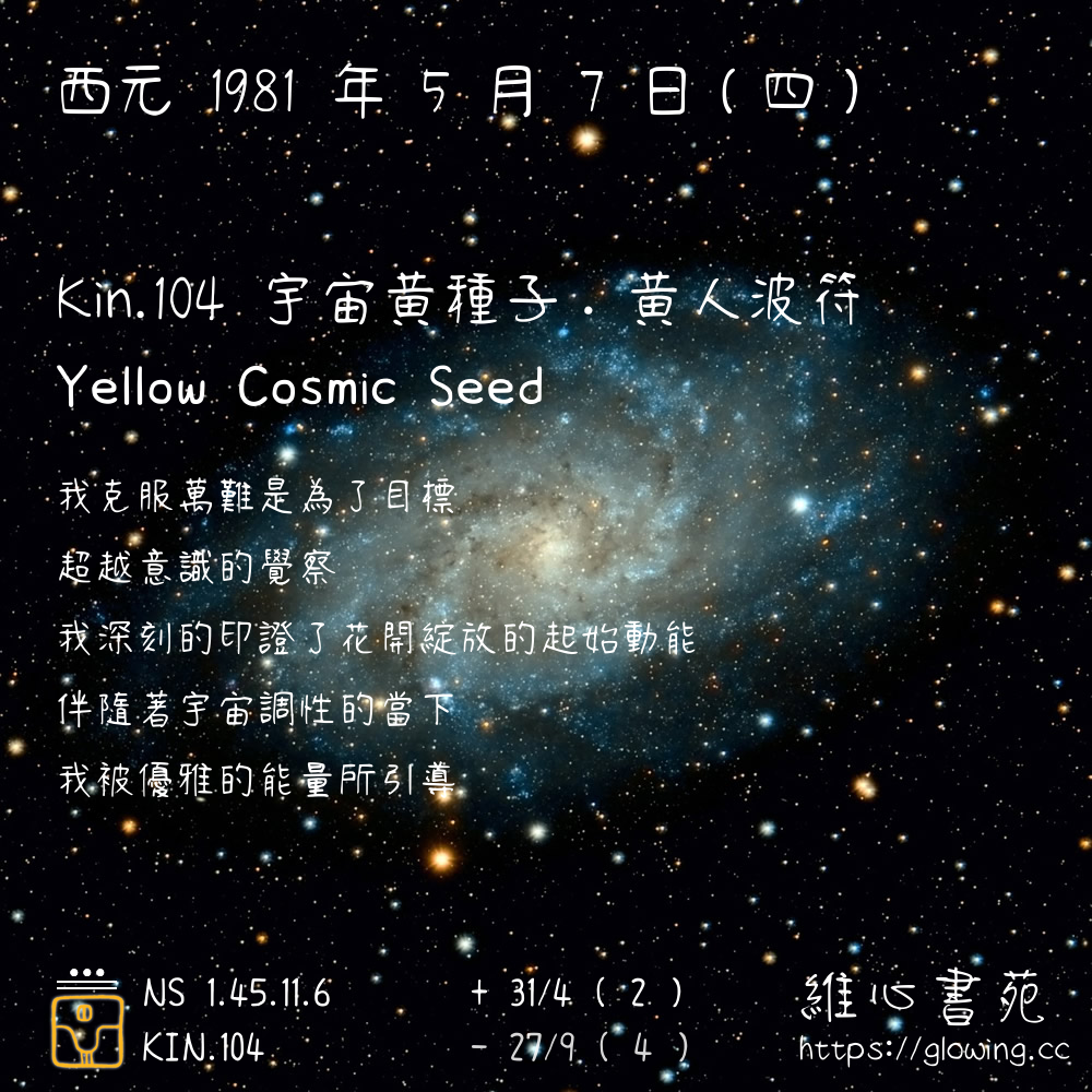 我們可以稱 KIN 104 為 【宇宙黃種子】 、 【宇宙的黃種子】 、 【黃人波符 之 宇宙黃種子】 也可以是 【宇宙黃種子.黃人波符】 ,你比較喜歡哪一個稱號呢?