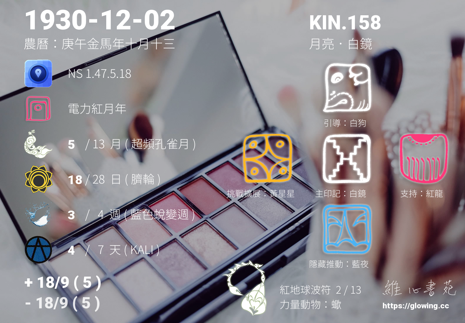我們可以稱 KIN 158 為 【月亮白鏡】 、 【月亮的白鏡】 、 【紅地球波符 之 月亮白鏡】 也可以是 【月亮白鏡.紅地球波符】 ,你比較喜歡哪一個稱號呢?