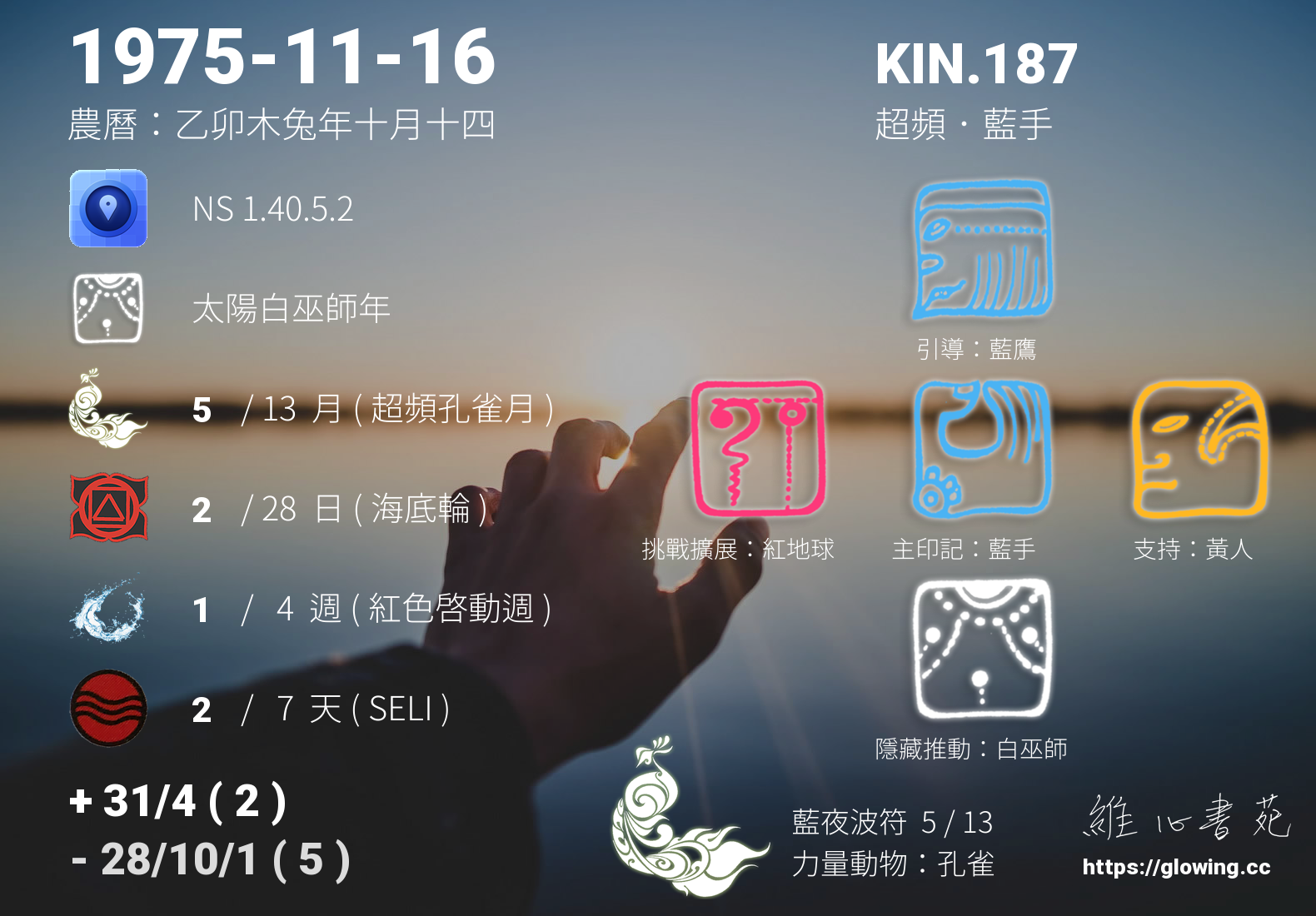 藍手的引導依據KIN的調性不同會有五種可能性,KIN.187的引導圖騰是藍鷹 , 透過藍鷹的引導,我們看透事物的本質,看到能量的型態,看到真實的架構,看到無與倫比的美麗,沒有什麼比真實的純粹更能讓我們感動與舒適,所有的一切在藍鷹的引導下,如實呈現。