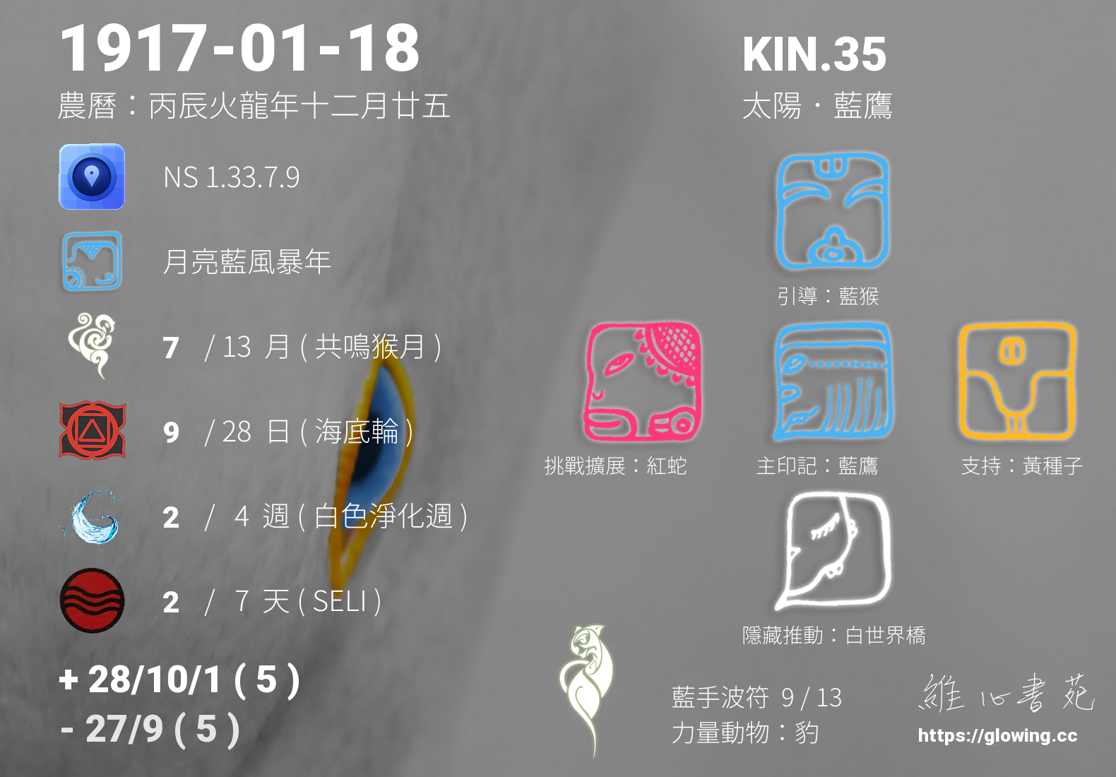 我們可以稱 KIN 35 為 【太陽藍鷹】 、 【太陽的藍鷹】 、 【藍手波符 之 太陽藍鷹】 也可以是 【太陽藍鷹.藍手波符】 ,你比較喜歡哪一個稱號呢?