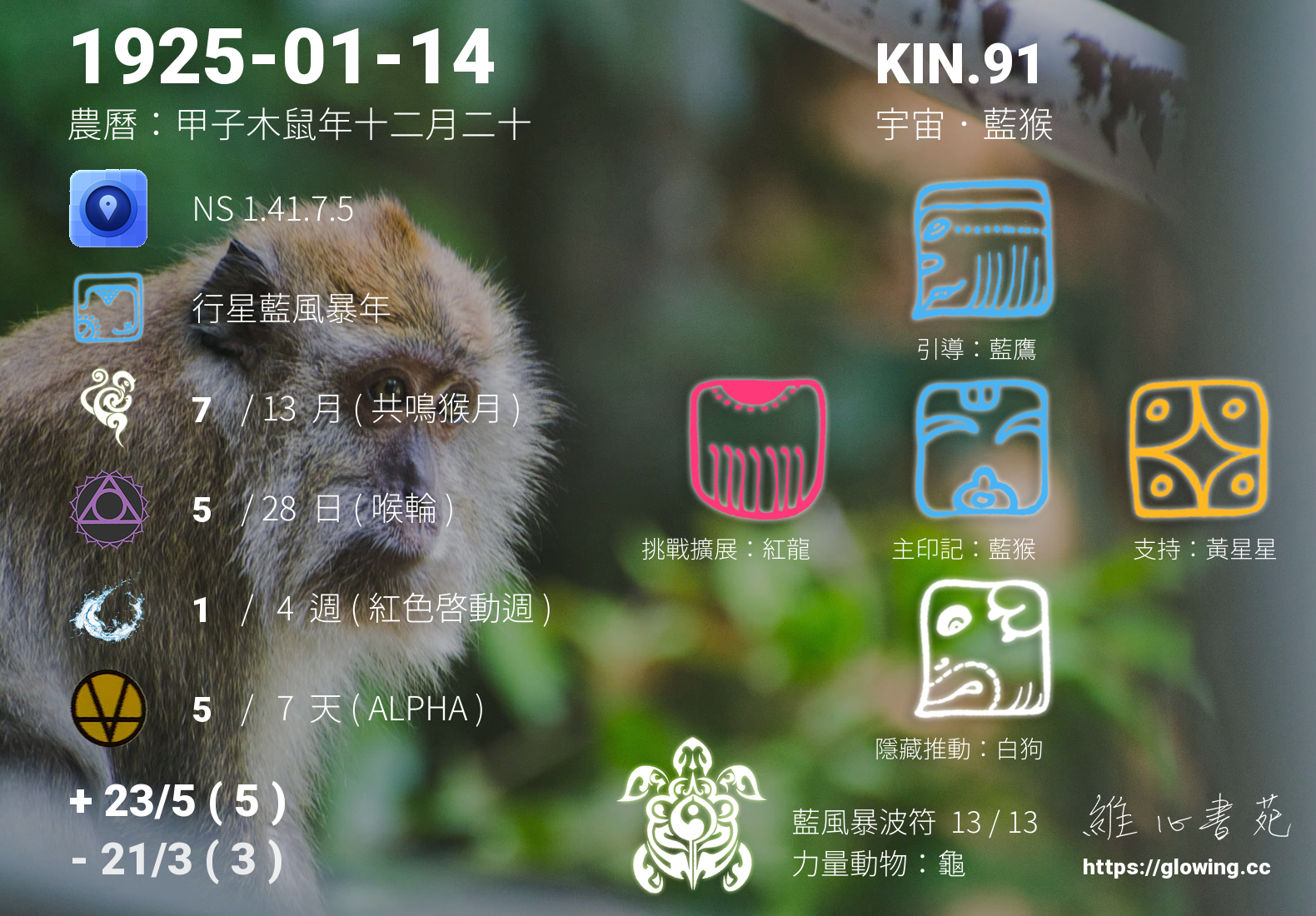 我們可以稱 KIN 91 為 【宇宙藍猴】 、 【宇宙的藍猴】 、 【藍風暴波符 之 宇宙藍猴】 也可以是 【宇宙藍猴.藍風暴波符】 ,你比較喜歡哪一個稱號呢?