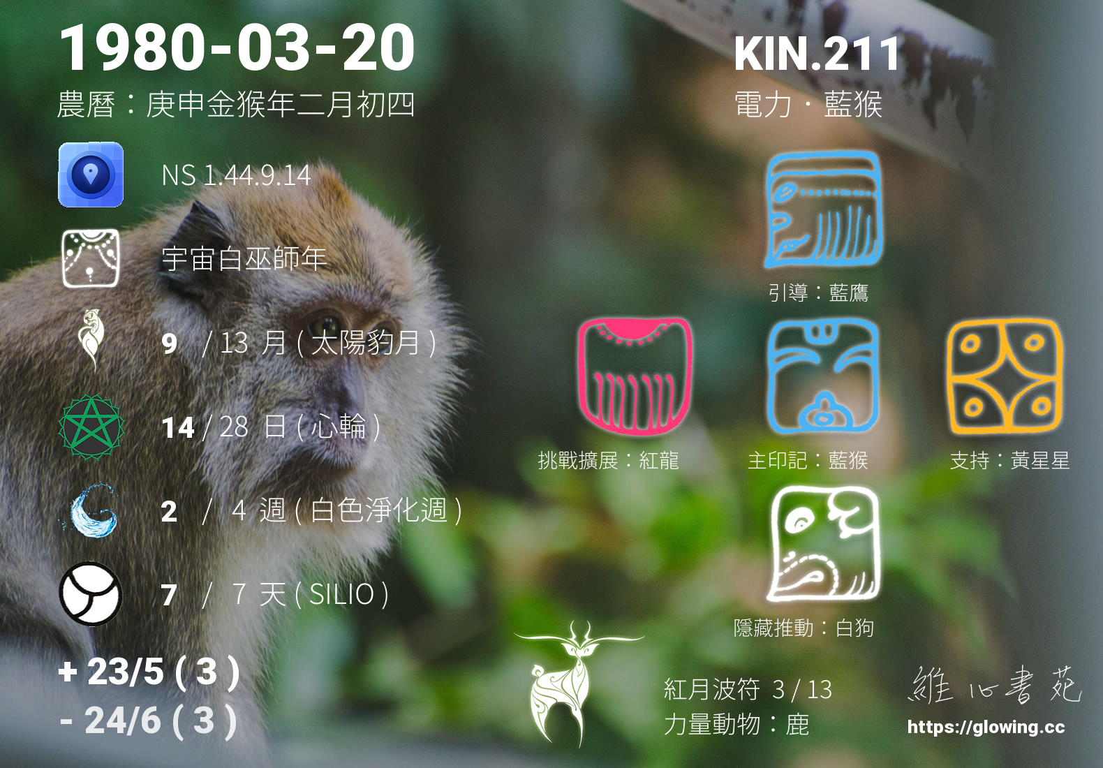 我們可以稱 KIN 211 為 【電力藍猴】 、 【電力的藍猴】 、 【紅月波符 之 電力藍猴】 也可以是 【電力藍猴.紅月波符】 ,你比較喜歡哪一個稱號呢?