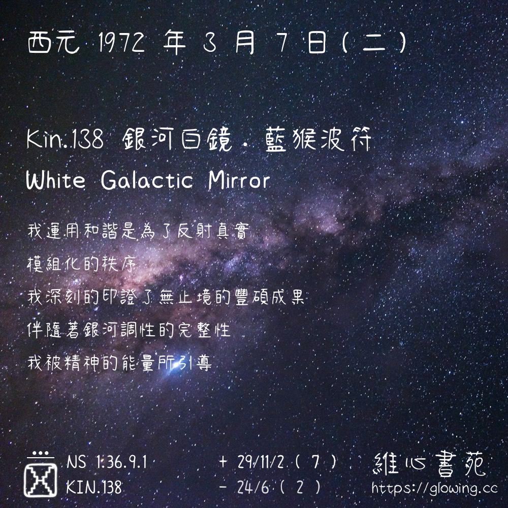 我們可以稱 KIN 138 為 【銀河白鏡】 、 【銀河的白鏡】 、 【藍猴波符 之 銀河白鏡】 也可以是 【銀河白鏡.藍猴波符】 ,你比較喜歡哪一個稱號呢?