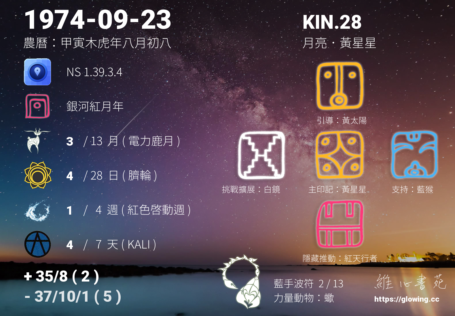 我們可以稱 KIN 28 為 【月亮黃星星】 、 【月亮的黃星星】 、 【藍手波符 之 月亮黃星星】 也可以是 【月亮黃星星.藍手波符】 ,你比較喜歡哪一個稱號呢?