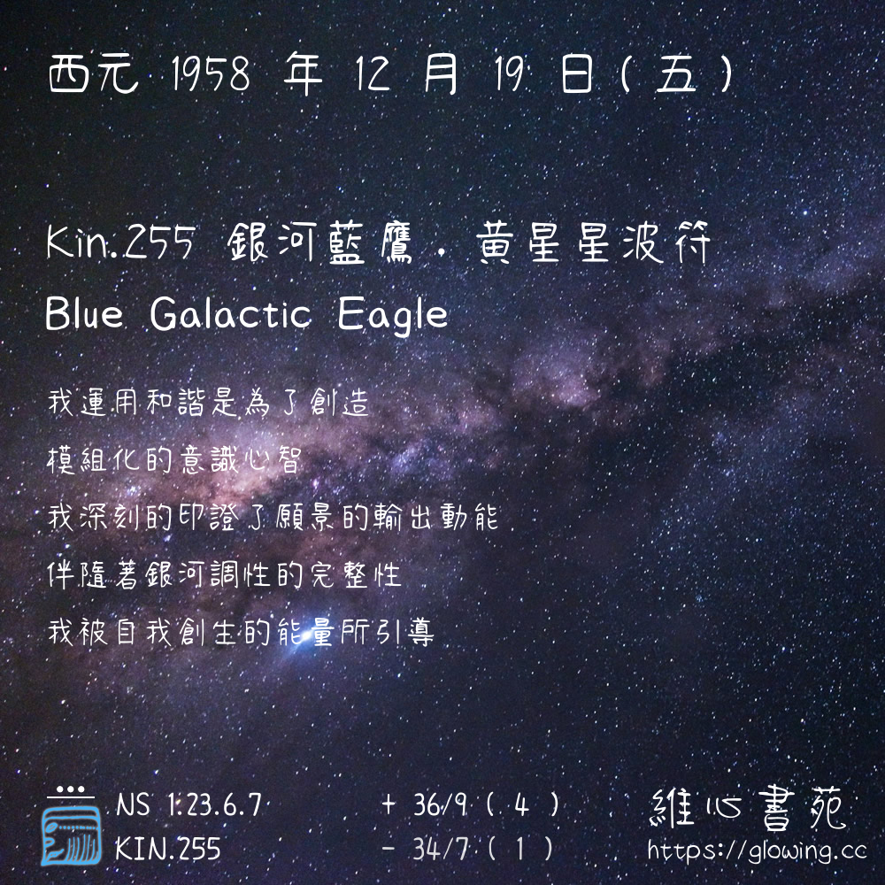 我們可以稱 KIN 255 為 【銀河藍鷹】 、 【銀河的藍鷹】 、 【黃星星波符 之 銀河藍鷹】 也可以是 【銀河藍鷹.黃星星波符】 ,你比較喜歡哪一個稱號呢?